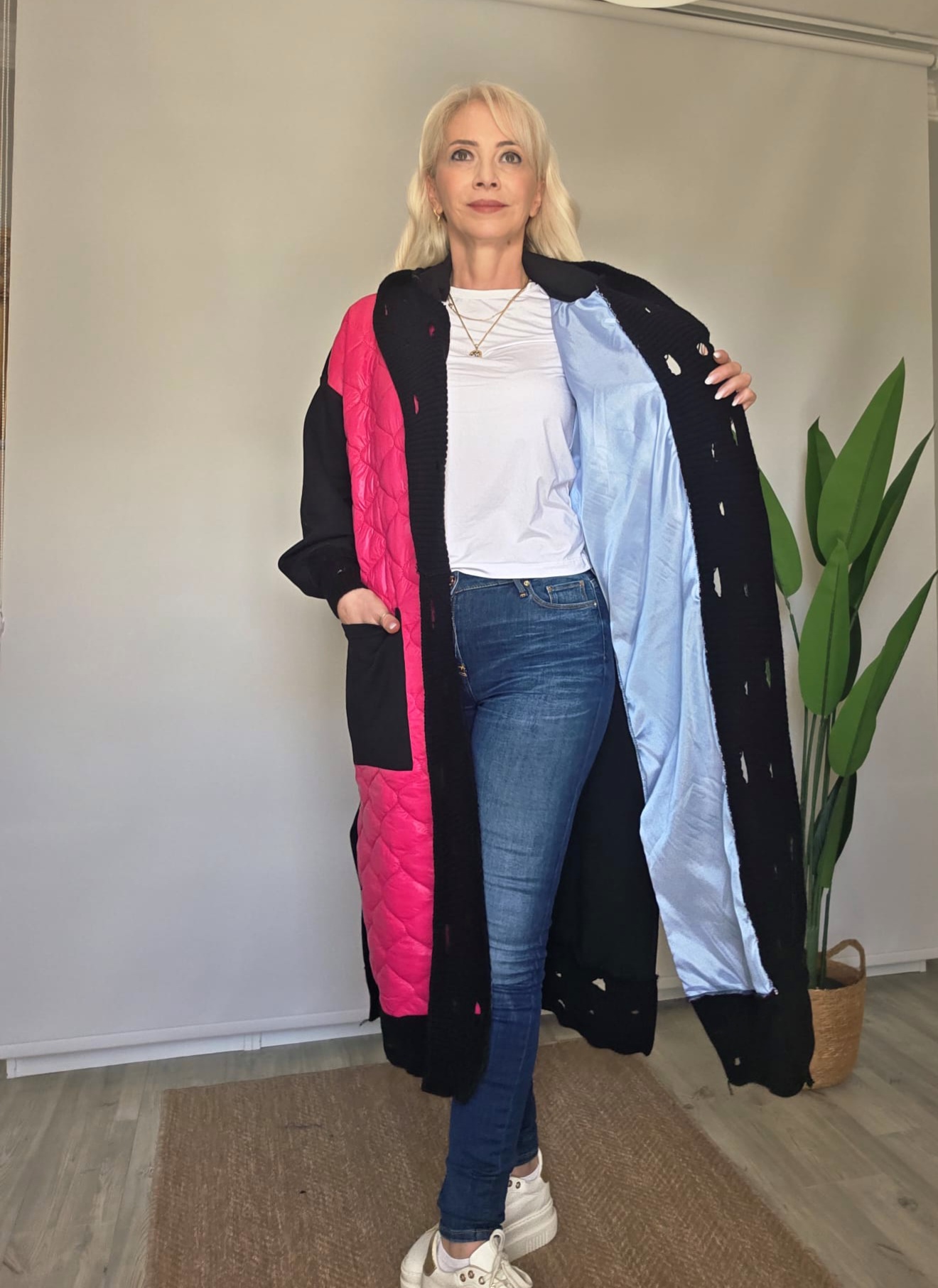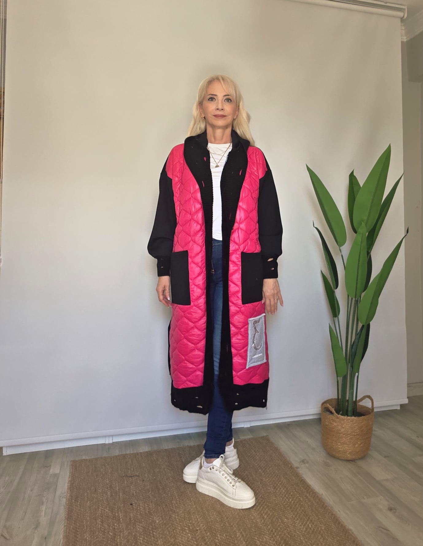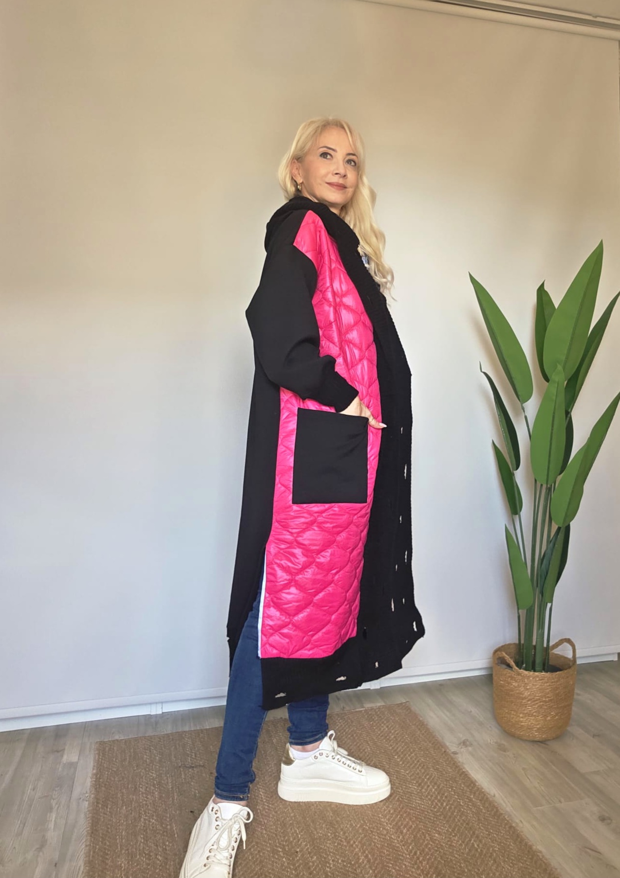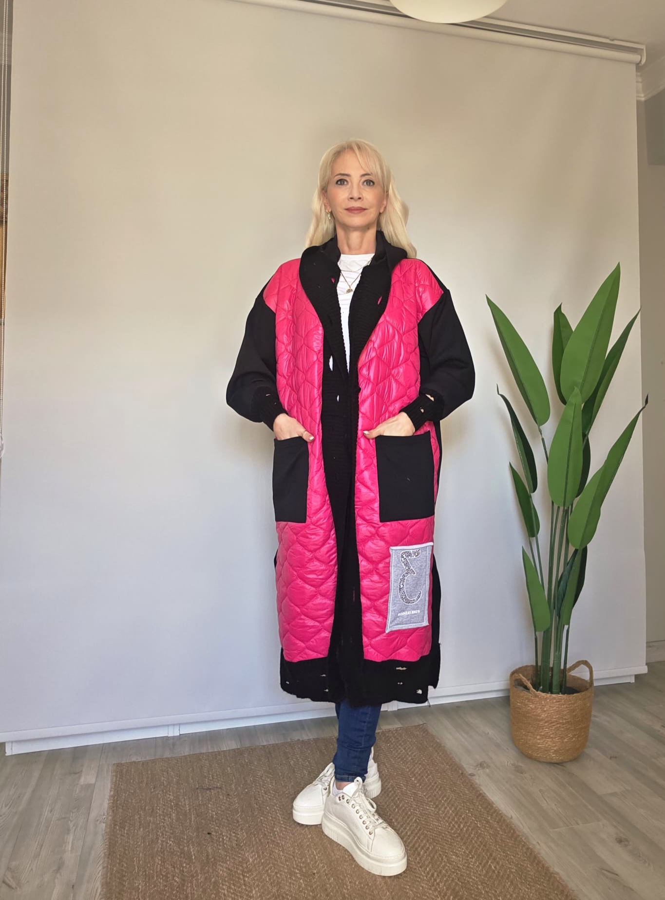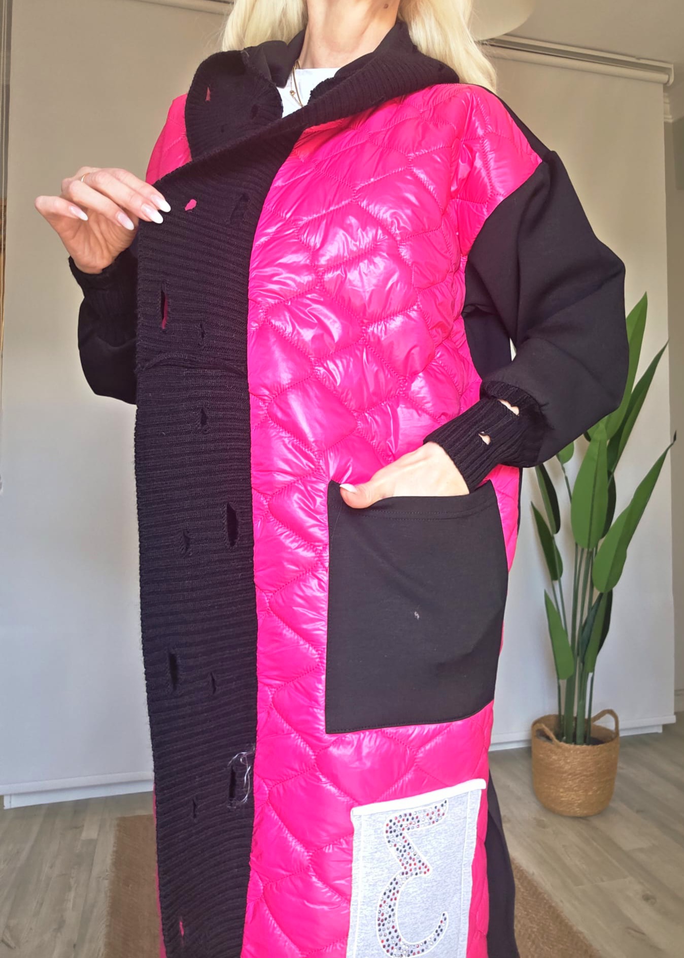 Fuşya kapitone anorak kumaşı , cepler sırtı çift iplik penye, kol ağızları etek uçları ve çerçeve siyah delikli triko
