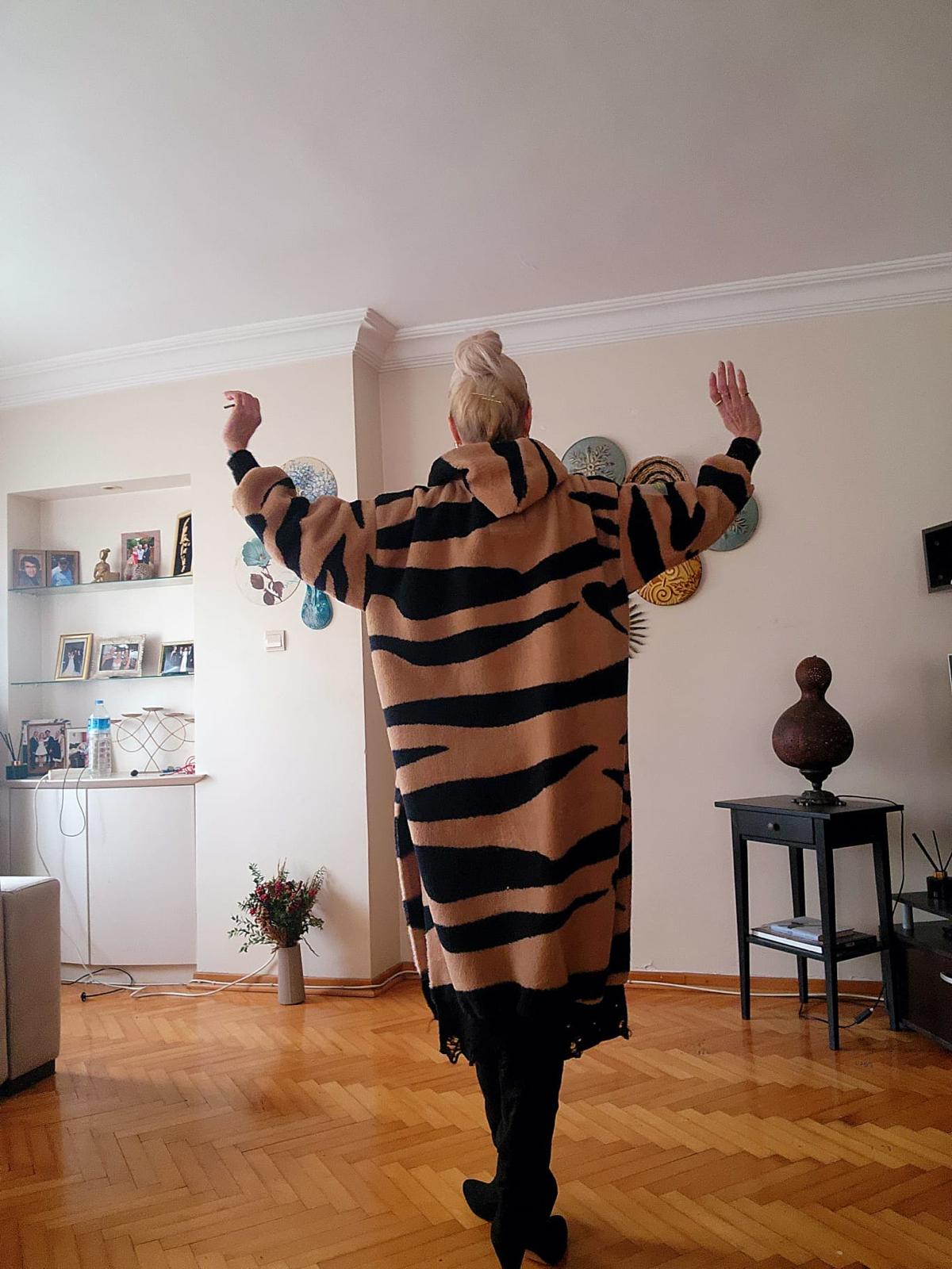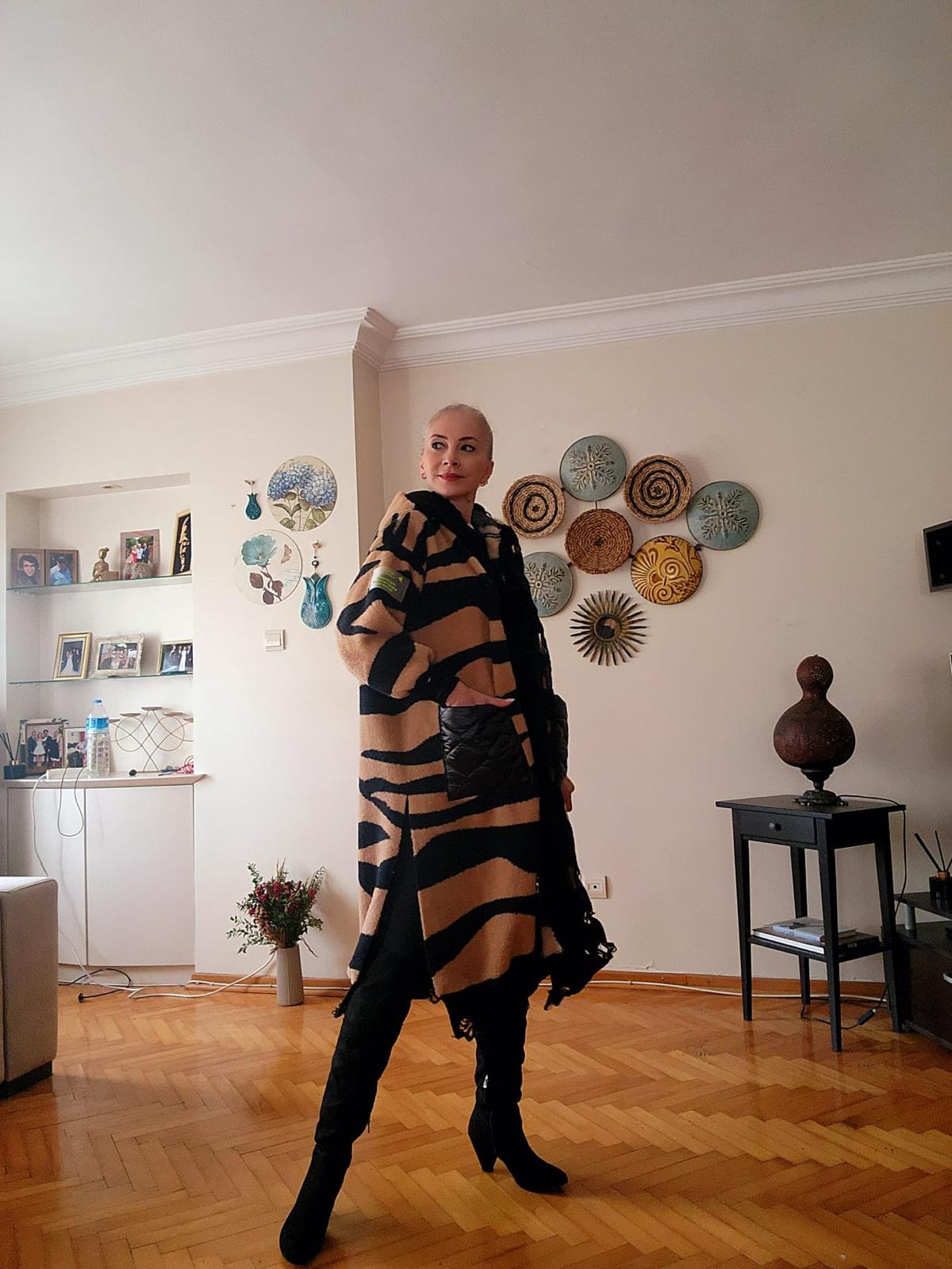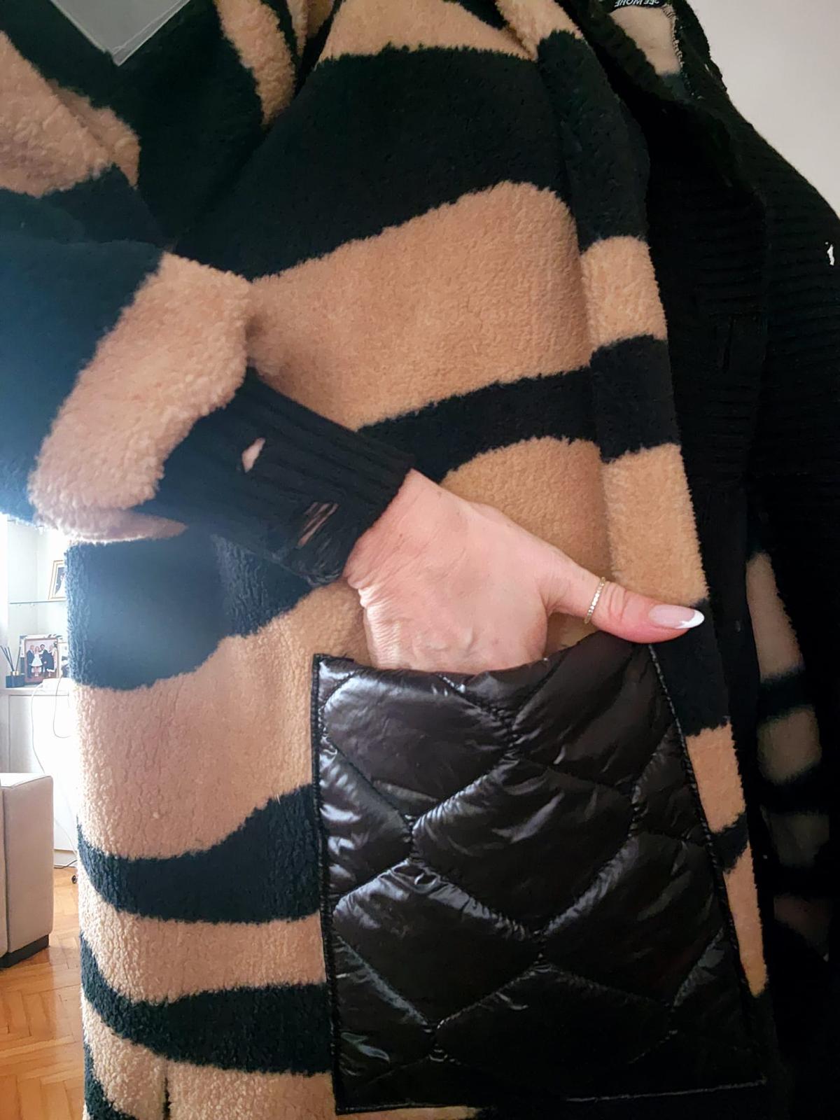 Sütlü kahve siyah zebra desen polar uzun mont önü açık kapişonlu