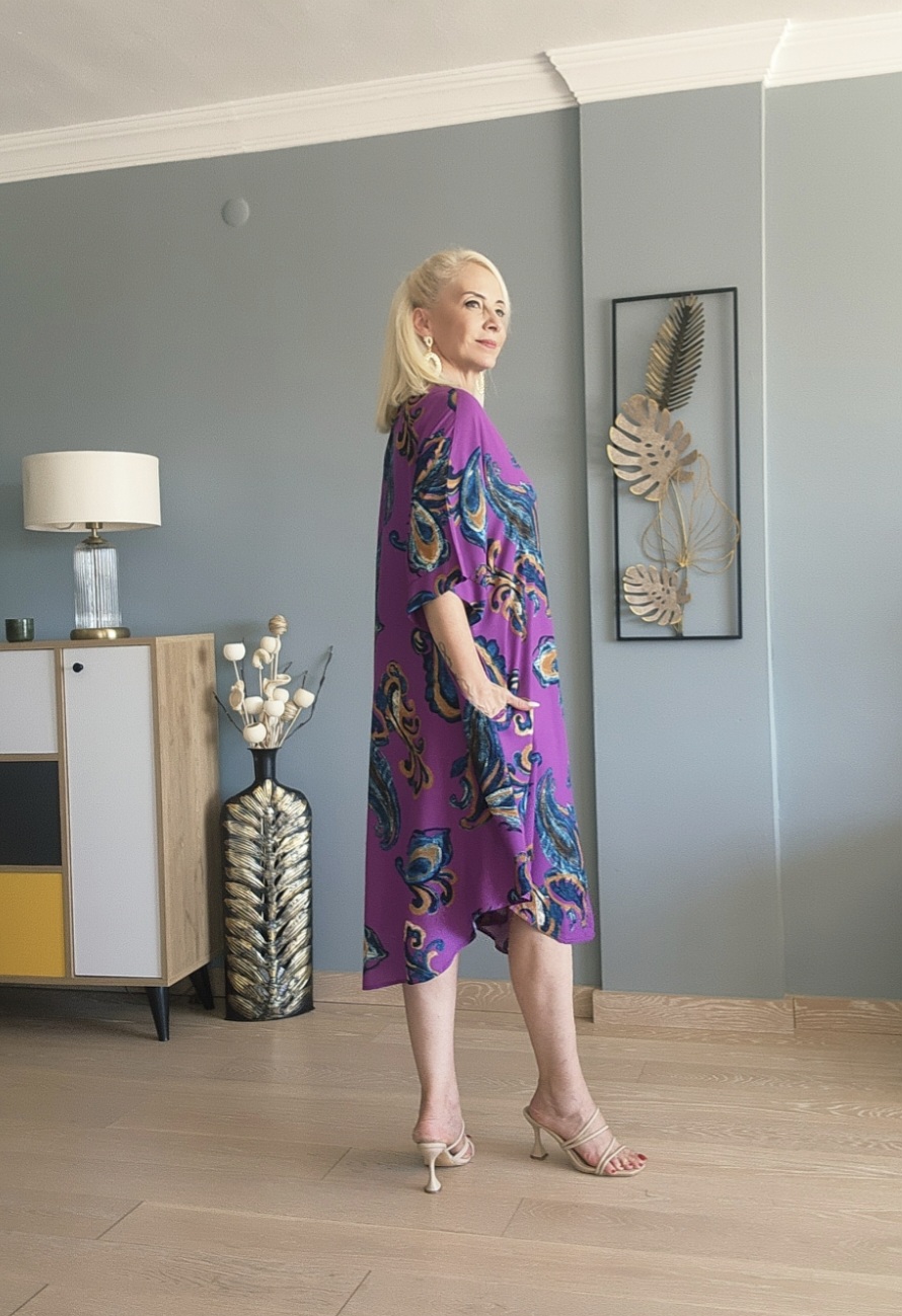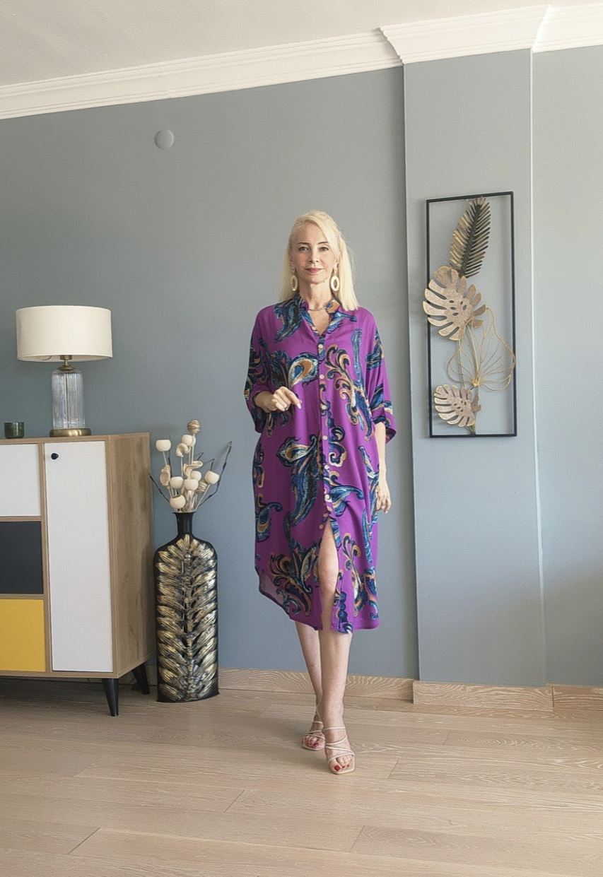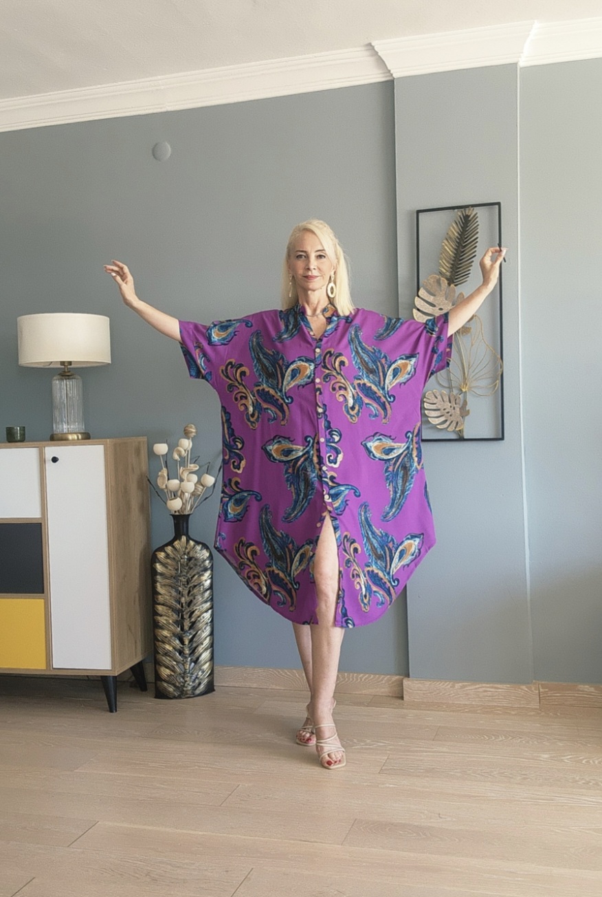 Şal desen pamuklu viskon Kısa kollu iki yandan cepli standart bedenlerde geniş kalıp gömlek elbise