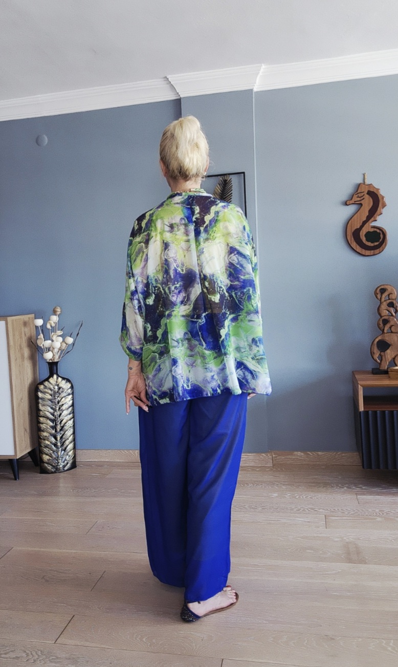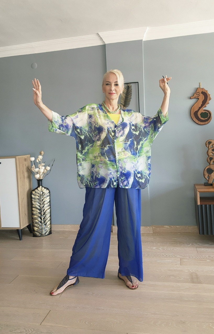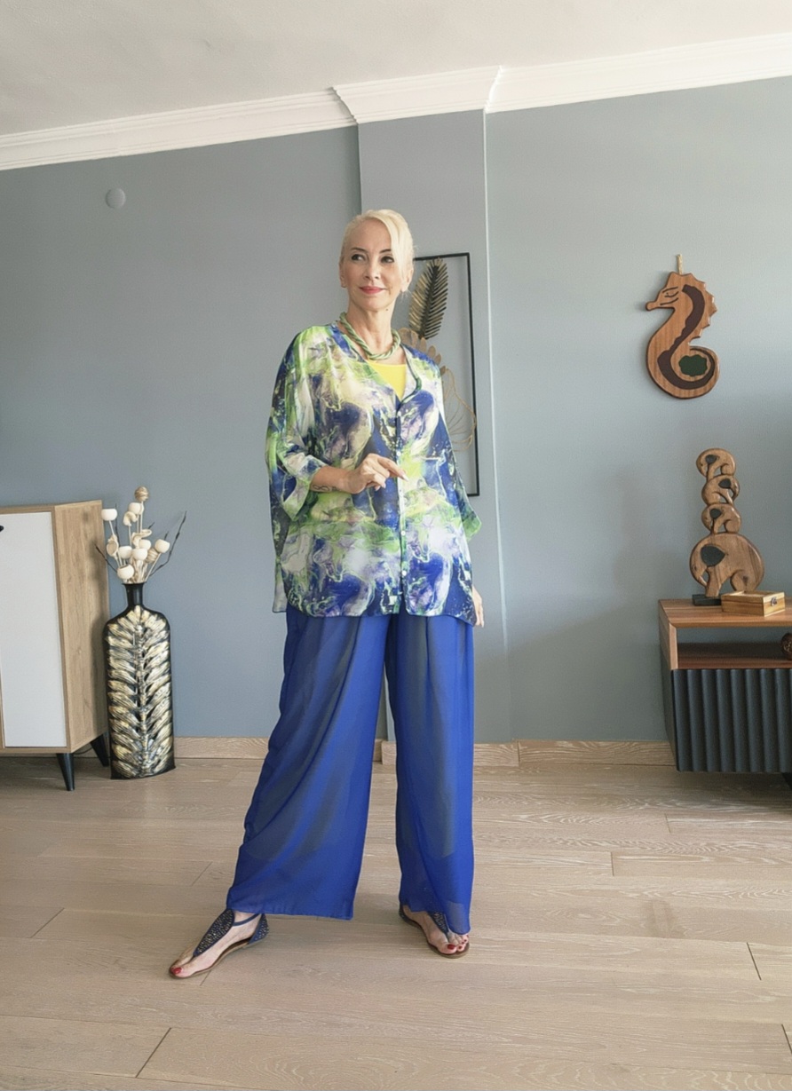 Saks ve sarı şifon üçlü takım pantolon beli lastikli sarı astar üzerine saks şifon,standart bedenlerde 38-40 bedenden 44-46 bedene kadar uyumludur