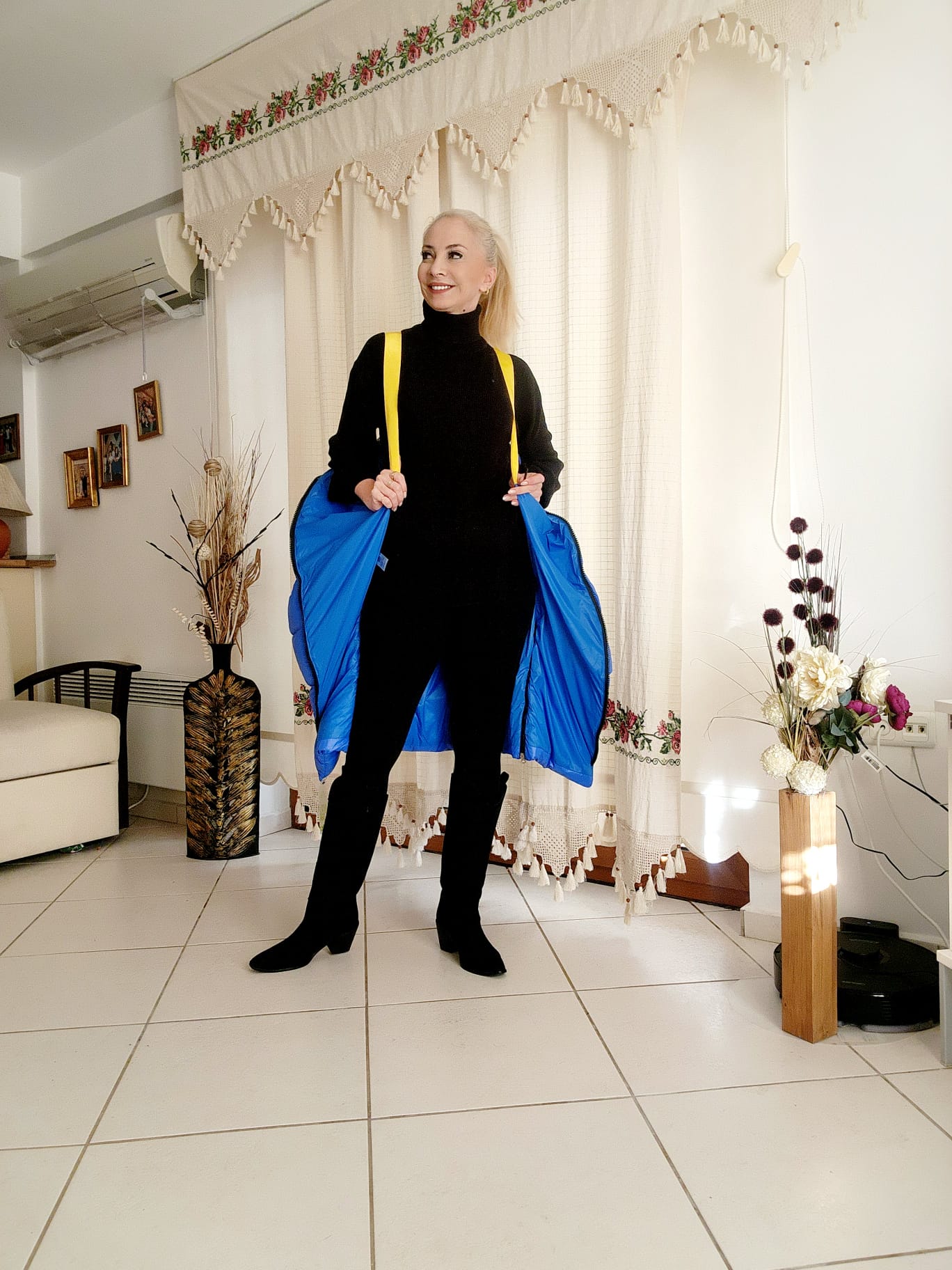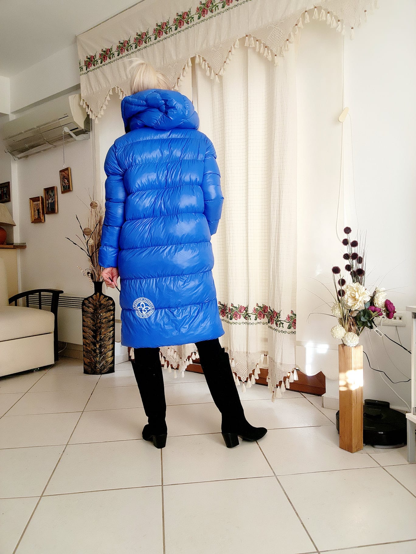 Saks elyaf dolgulu omuz askılı detay kapişonlu uzun şişme mont