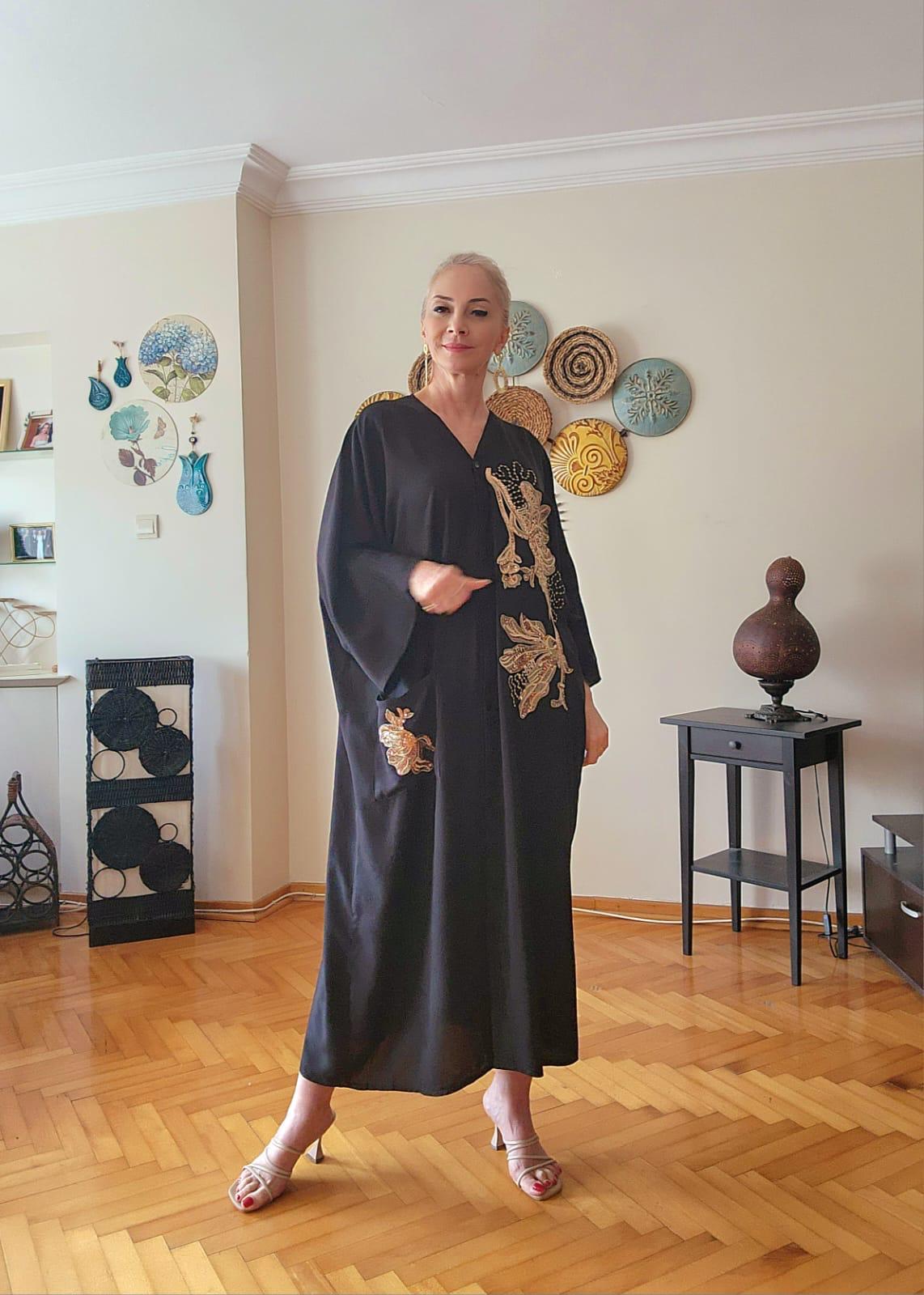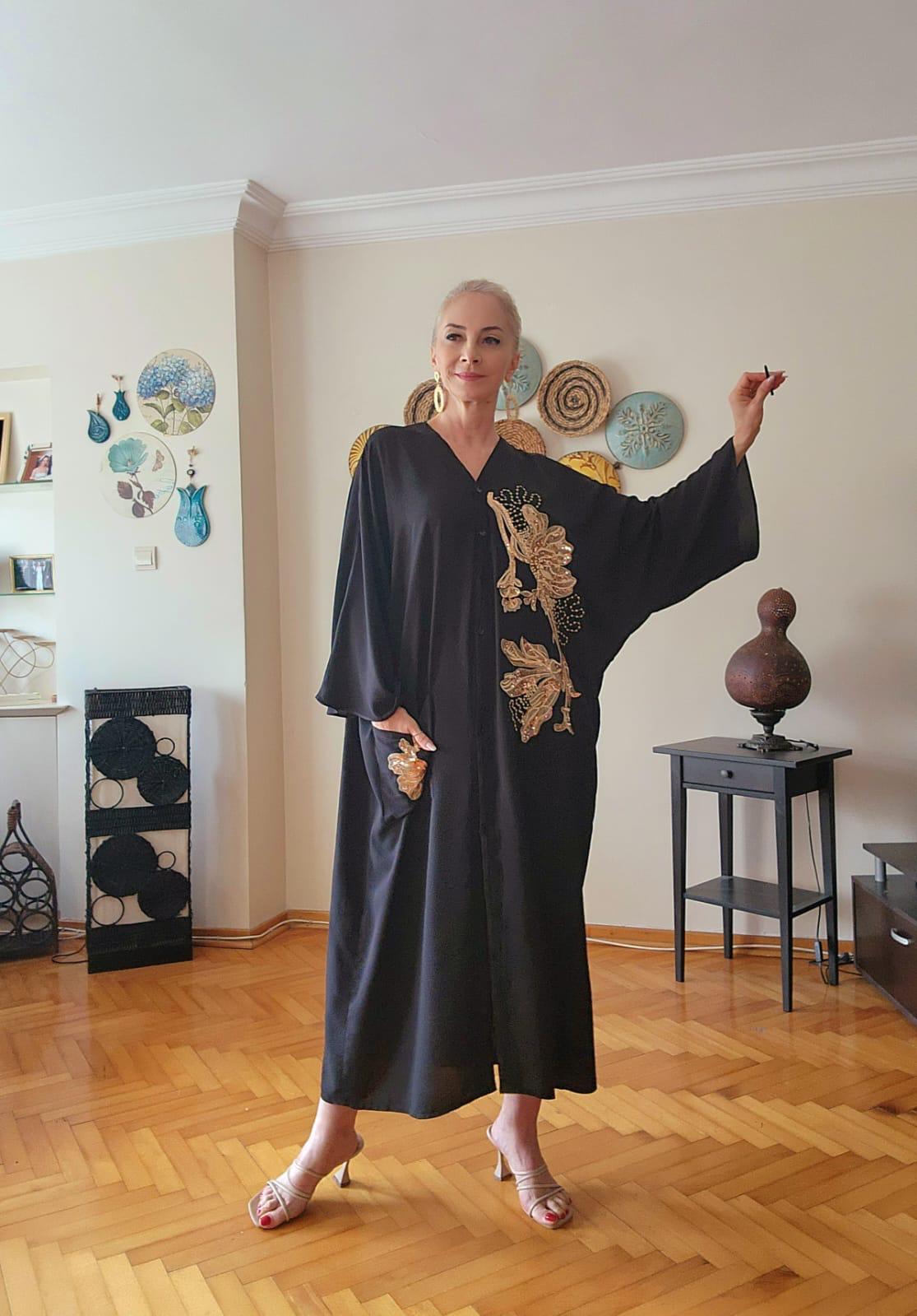 Siyah pamuklu viskon  altın rengi payet işlemeli standart bedenlerde geniş kalıp gömlek elbise