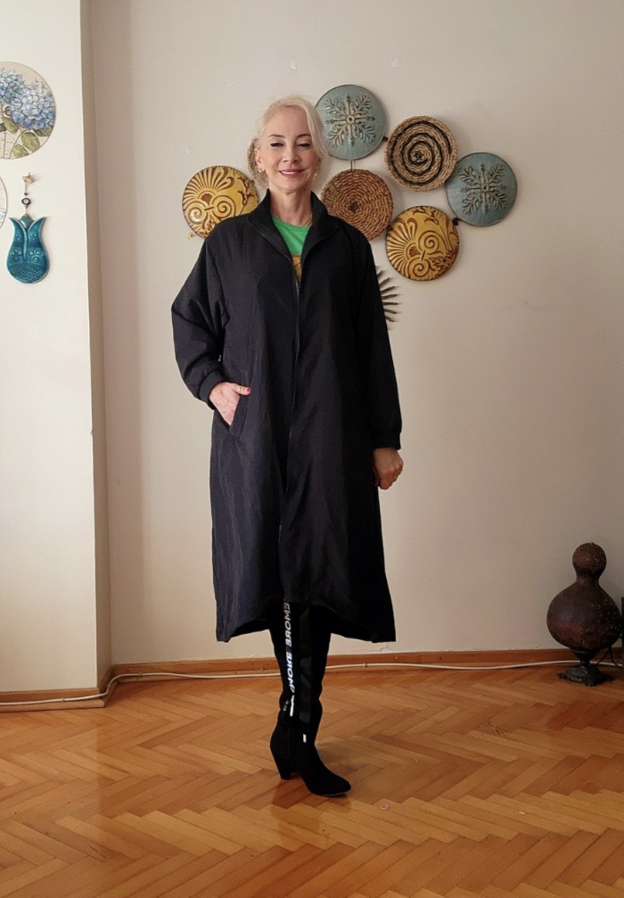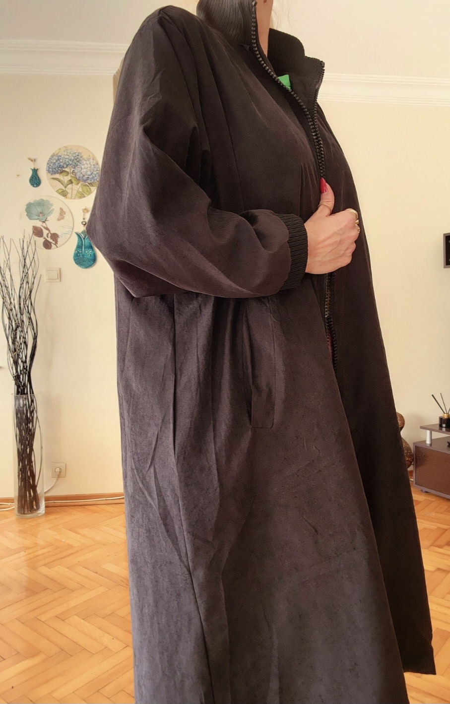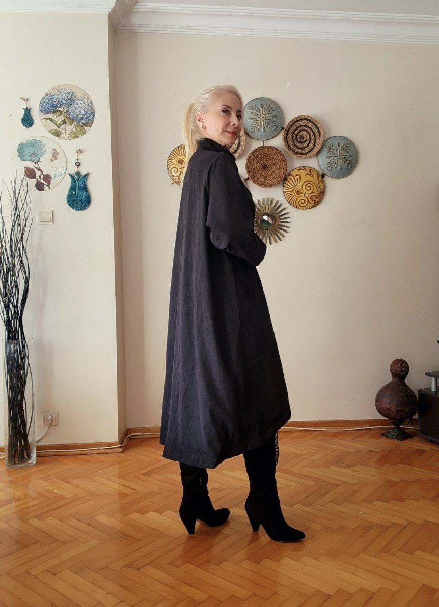 Siyah çan kalıp önü fermuarlı standart bedenlerde geniş kalıp 38-40 bedenden 46-48 bedene kadar uyumludur