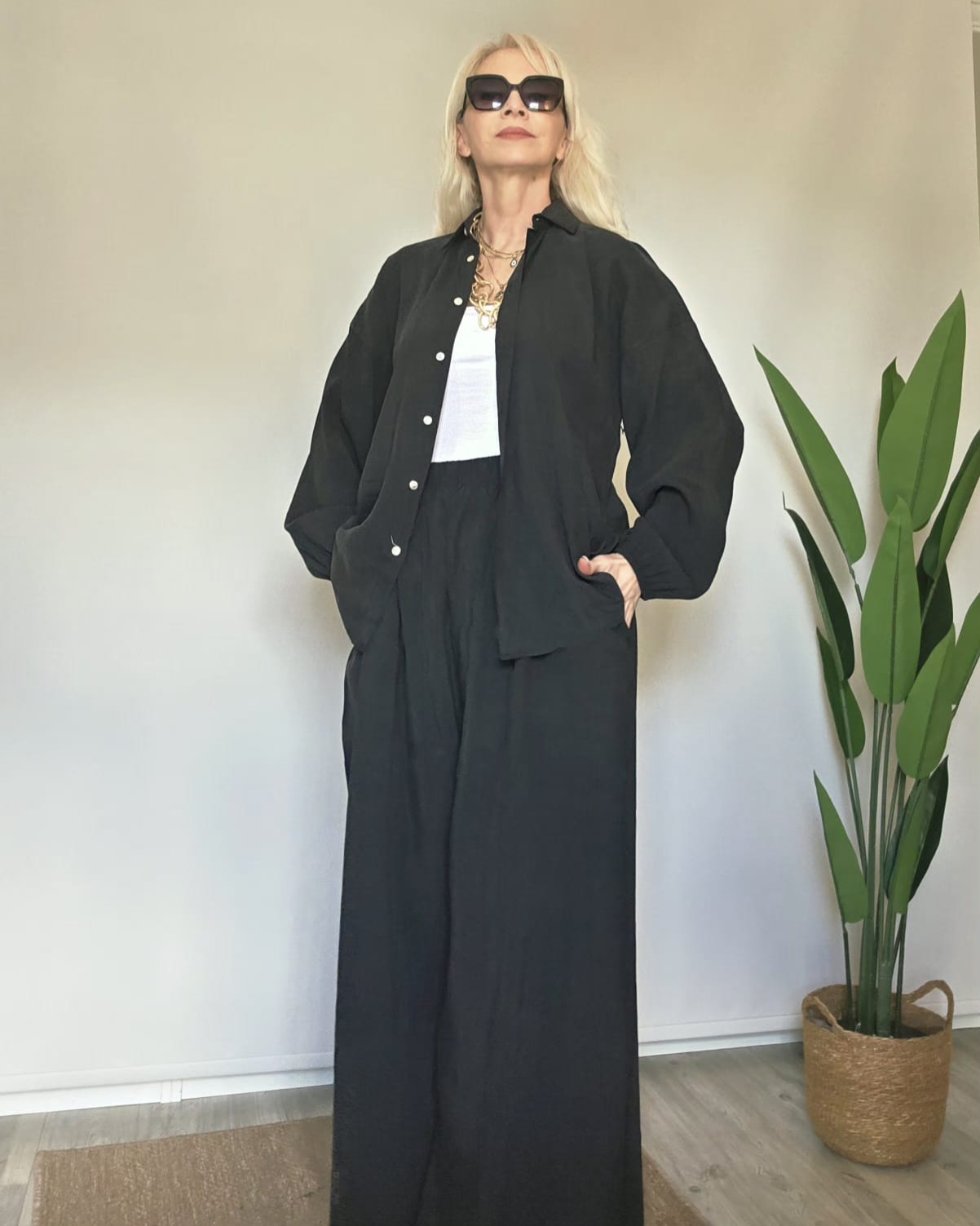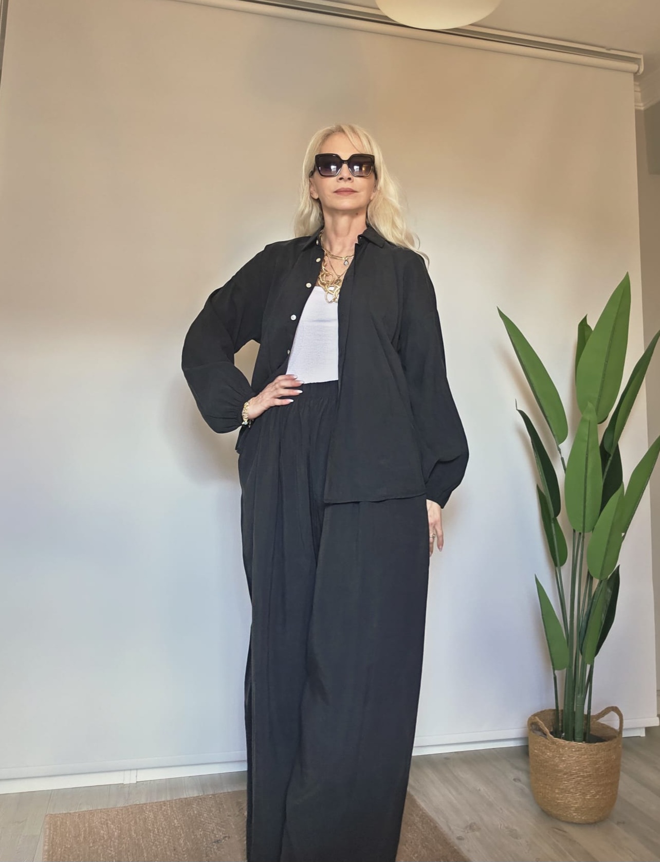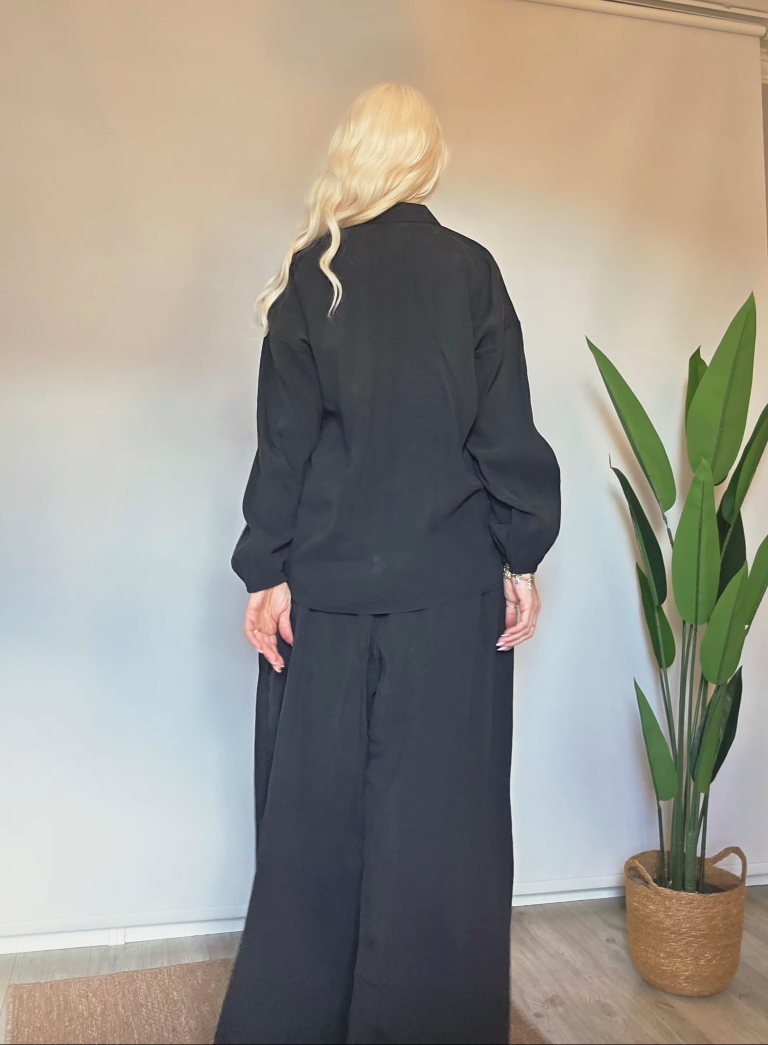Siyah tensel kumaş,  M / L / XL bedenlerde , pantolon beli lastikli geniş palazzo kalıp her iki yandan cepli takım