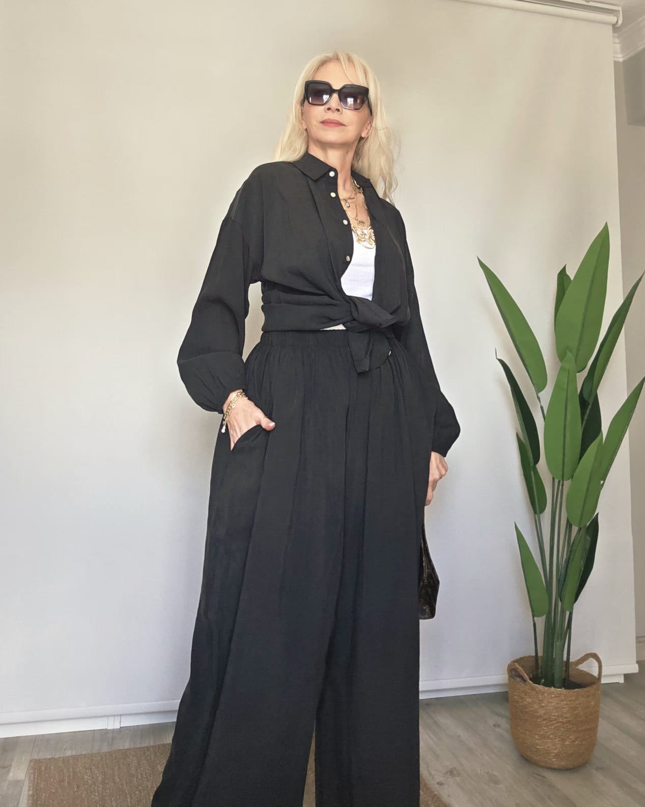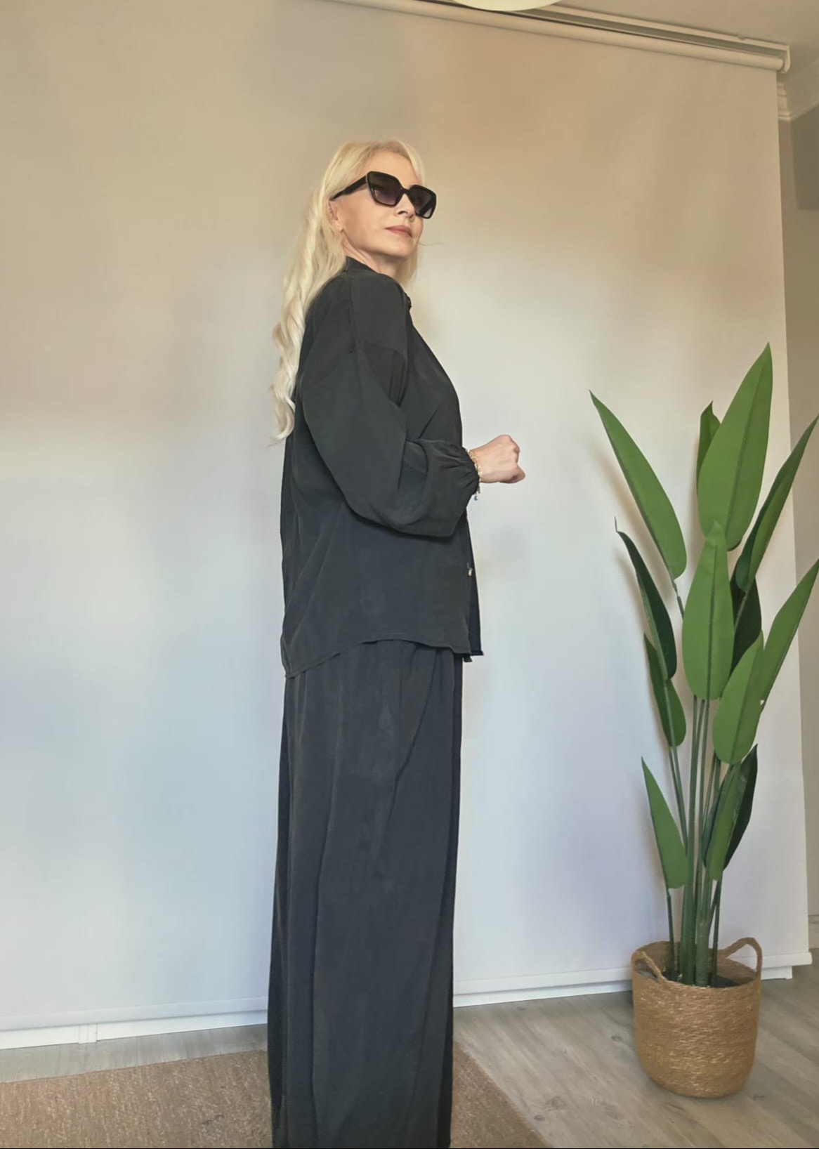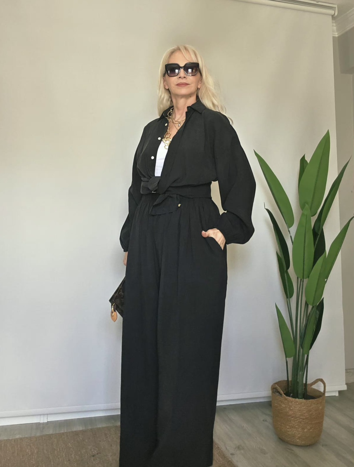 Siyah tensel kumaş,  M / L / XL bedenlerde , pantolon beli lastikli geniş palazzo kalıp her iki yandan cepli takım