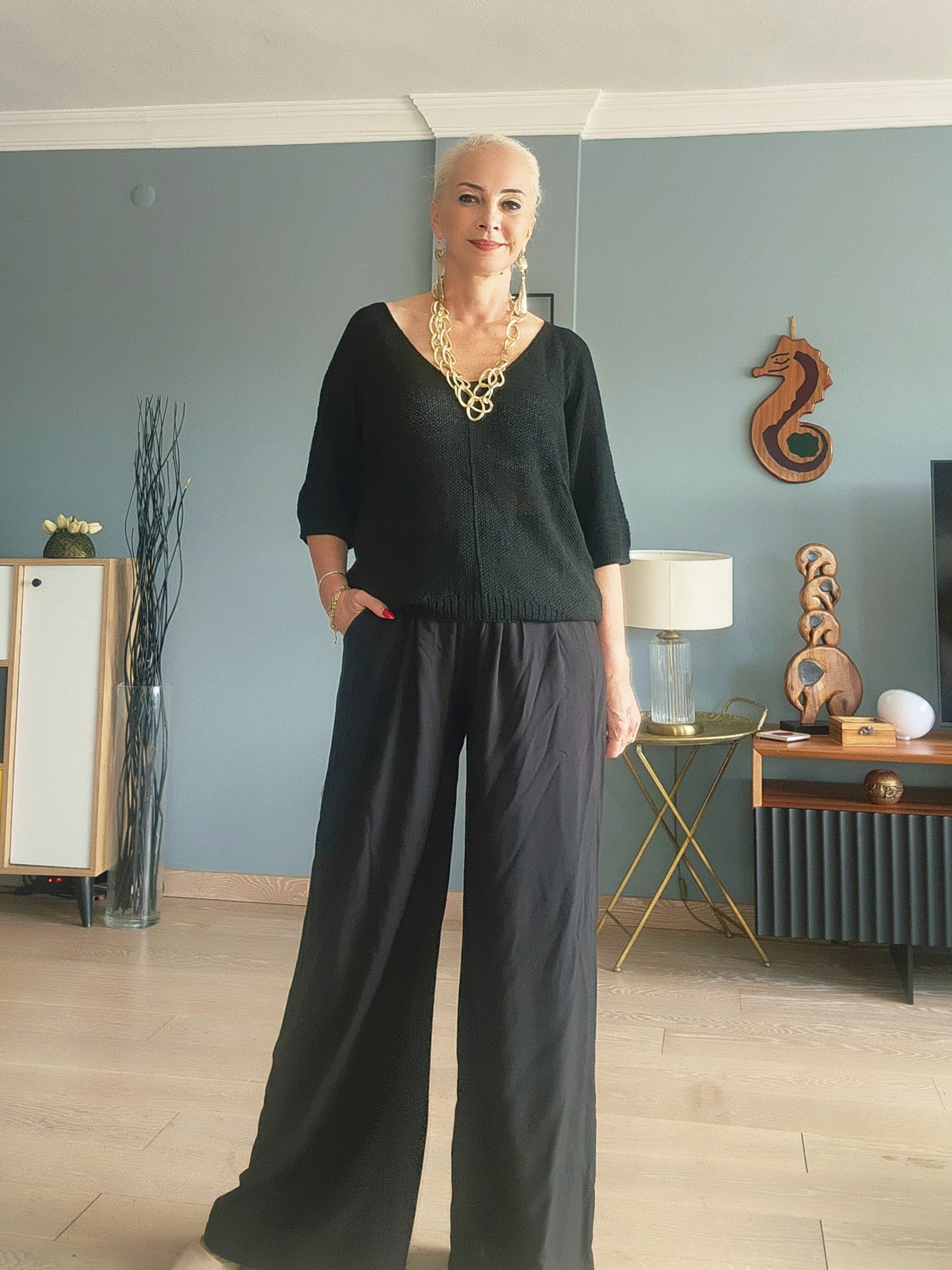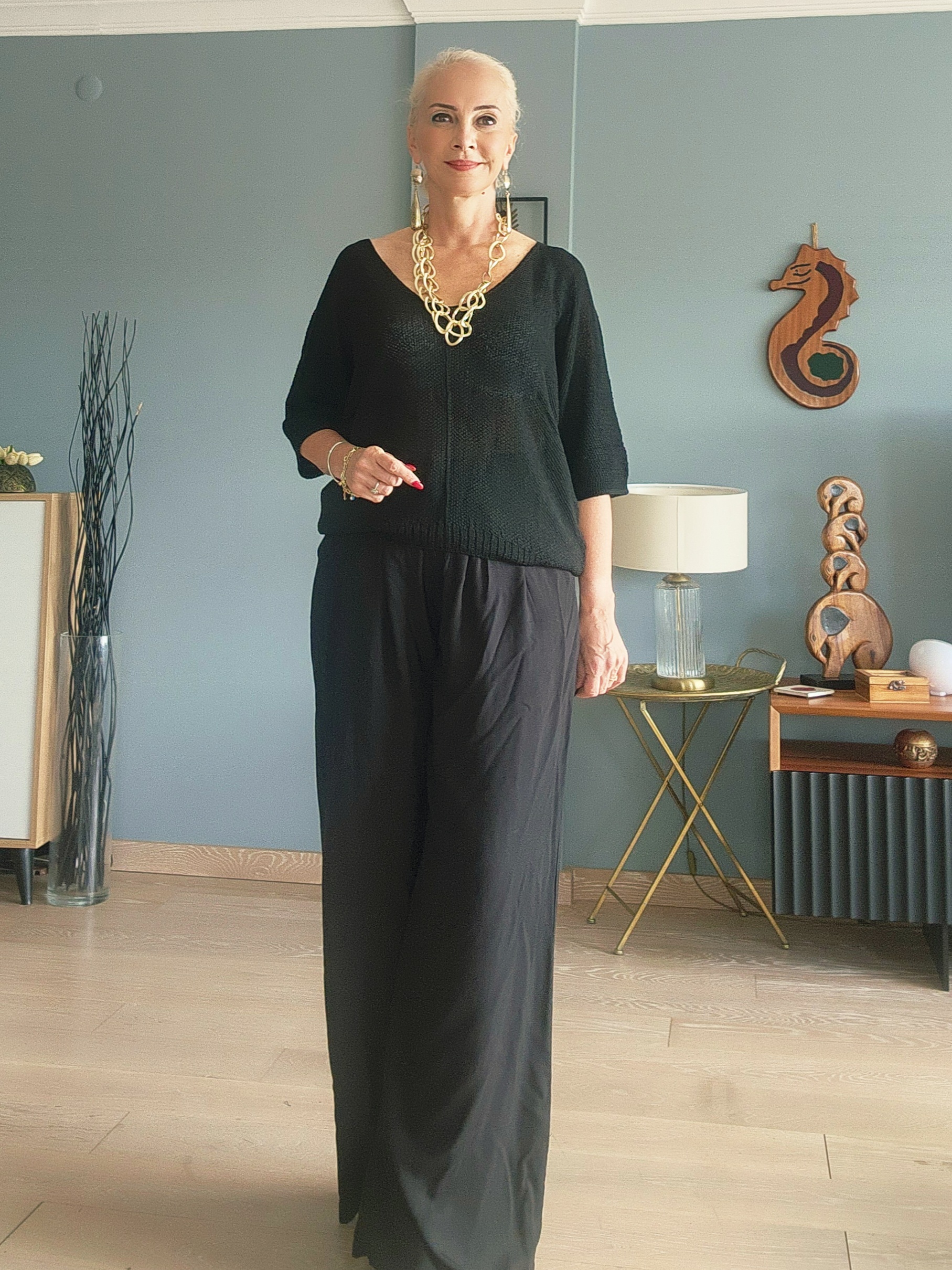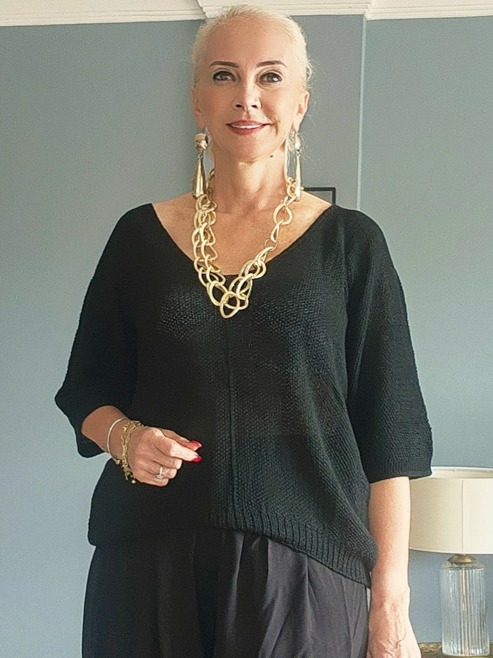 Siyah kapri kollu V yaka merserize Standart bedenlerde geniş kalıp 38-40 bedenden 46-48 bedene kadar uyumludur